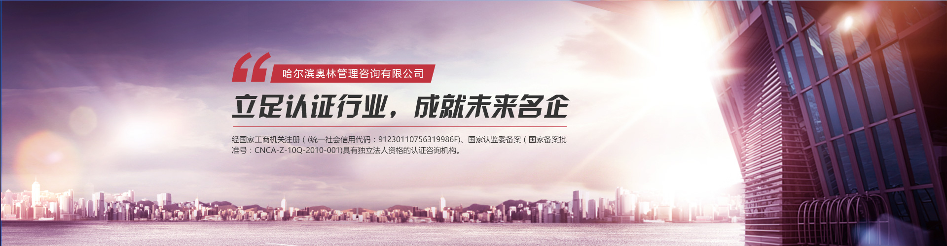 奧林公司是黑龍江省通過國家的再度資格審查,在東三省擁有自己正規(guī)辦公場(chǎng)所并具有國家注冊(cè)資質(zhì)(六標(biāo)咨詢資質(zhì):ISO9001/ISO14001/ISO45001/HACCP/有機(jī)認(rèn)證/TS16949,國家注冊(cè)備案時(shí)間:2010年1月19日-2014年11月18日)的認(rèn)證咨詢公司。奧林公司是咨詢業(yè)內(nèi)專家資質(zhì)全和專業(yè)范圍完整的國家注冊(cè)備案時(shí)間長的黑龍江大型咨詢機(jī)構(gòu)。奧林公司的理念是:做企業(yè)與做人一樣,追求真誠,追求永遠(yuǎn)。